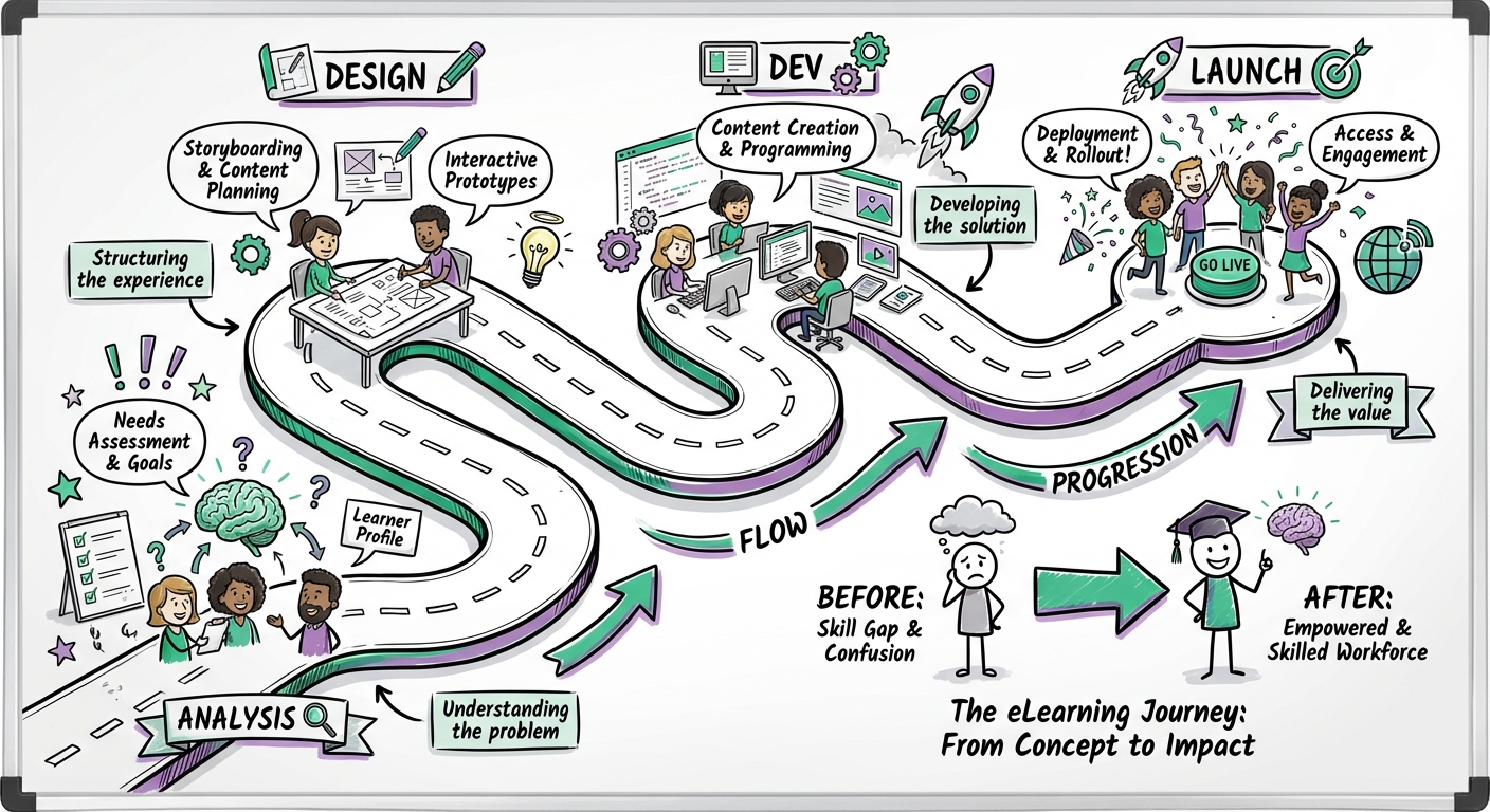 TL;DR: The eLearning development process transforms training needs into digital learning experiences through 8 key stages: Analysis, Design, Content Development, Technical Development, Implementation, Evaluation, Maintenance, and ongoing Project Management. Success requires a balance of instructional strategy, technical stability, and stakeholder alignment, typically spanning a 3-6 month timeline for custom courses.